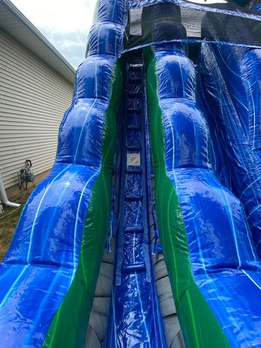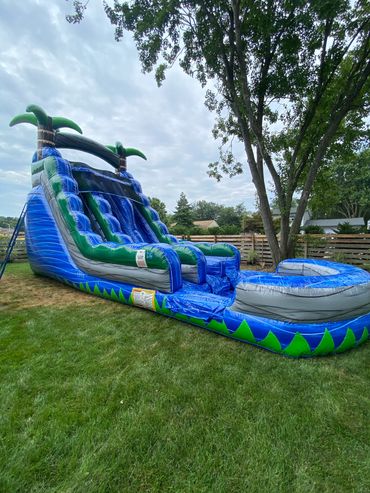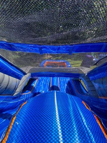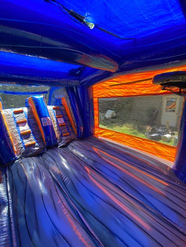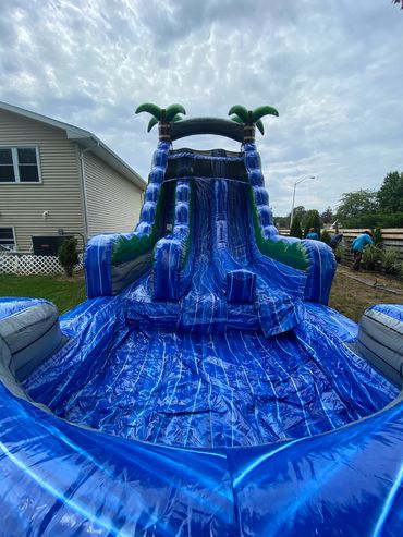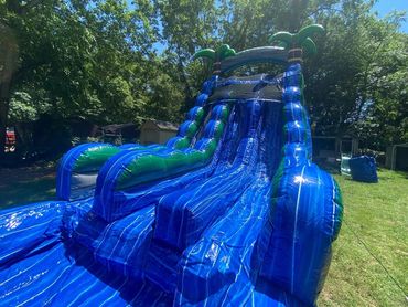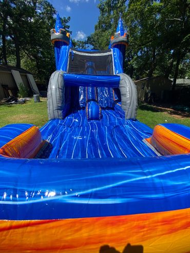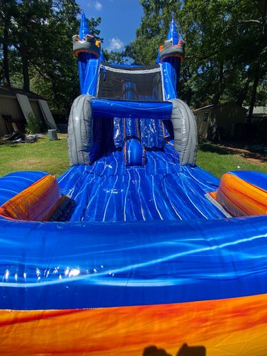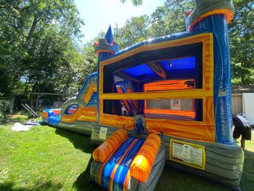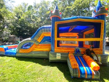 Orange crush has a large double slide, jumping area, basketball hoop, and option to be used wet or dry